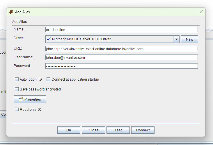 jdbc:sqlserver://invantive-exact-online.database.invantive.comwhere you place the SQL Server host name after// - User Name: specify the Invantive Cloud user name
