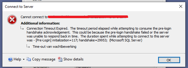 This could be because the pre-login handshake failed or the server was unable to response back in time.