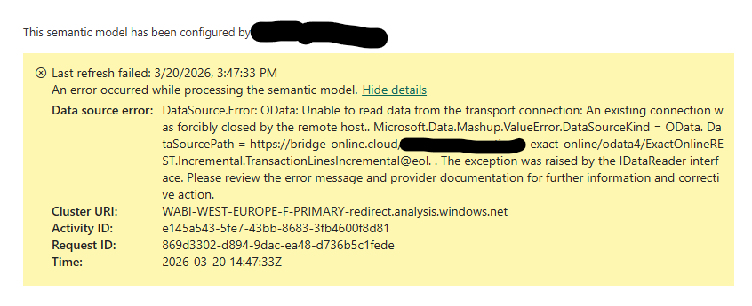 We hebben een Power BI dashboard dat connect met Exact Online maar sinds december ververst het dashboard niet meer. Soms doet hij het wel opeens weer (ongeveer 1x per week lukt het opeens wel) en dan de rest van de week niet meer.