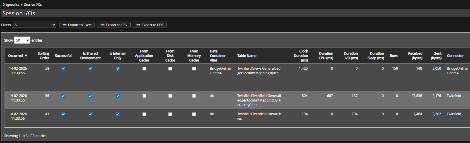 Attentie! Merk op dat enkel data van verzoeken van de huidige dag (sinds 0:00 UTC) zichtbaar zijn. Sessie-I/O’s van voorgaande dagen zijn niet beschikbaar.