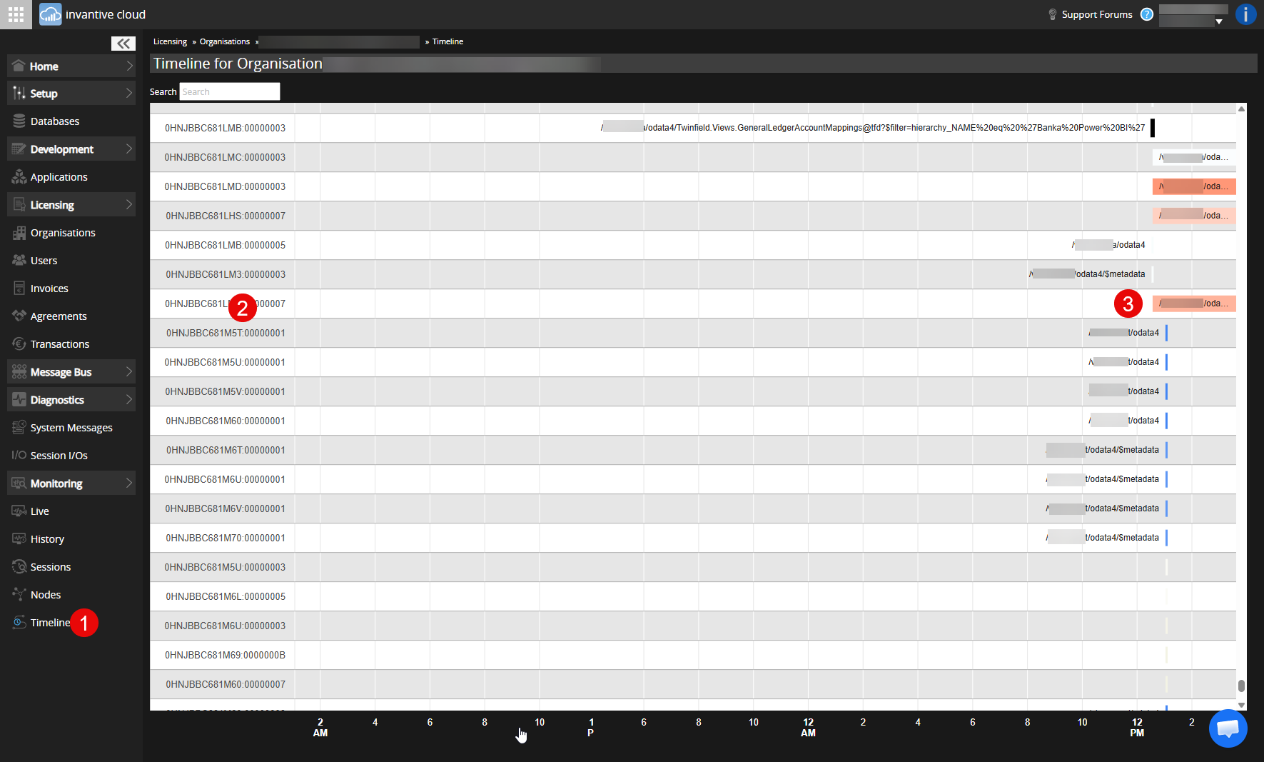 De Timeline is te vinden vanuit het Monitoring-menu (rode 1). Bij het zweven over een verzoek (rode 2 en rode 3) komt een venster te voorschijn.