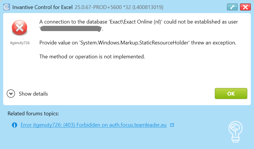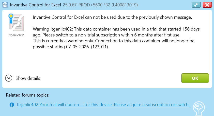 Invantive Control for Excel can not be used due to the previously shown message.