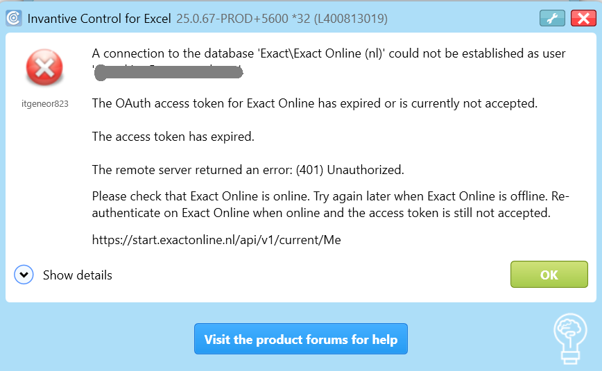 The OAuth access token for Exact Online has expired or is currently not accepted.