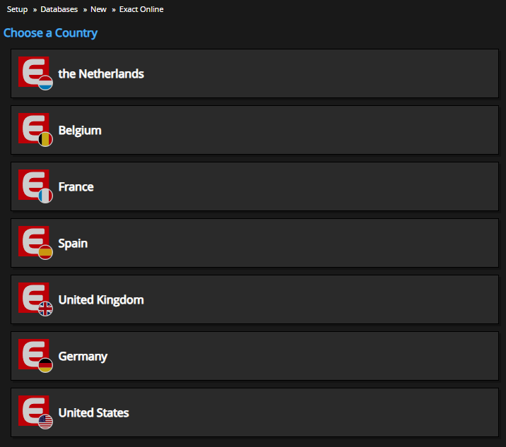 https://cloud.invantive.com/app/setup/databases/new/exactonline. - Kies het gewenste land: