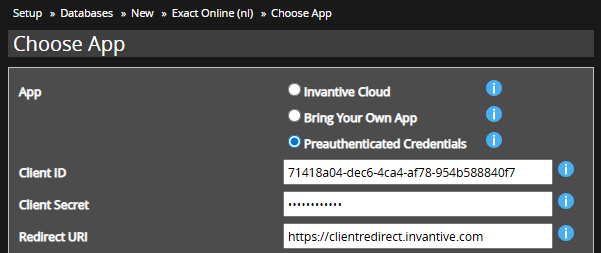 Op geselecteerde platformen waaronder Exact Online en Twinfield biedt Invantive Cloud de mogelijkheid om de OAuth autorisatie buiten Invantive Cloud te doorlopen. De resulterende credentials kunnen dan (later) gebruikt worden om een Invantive Cloud-database voor het desbetreffende platform te registreren.