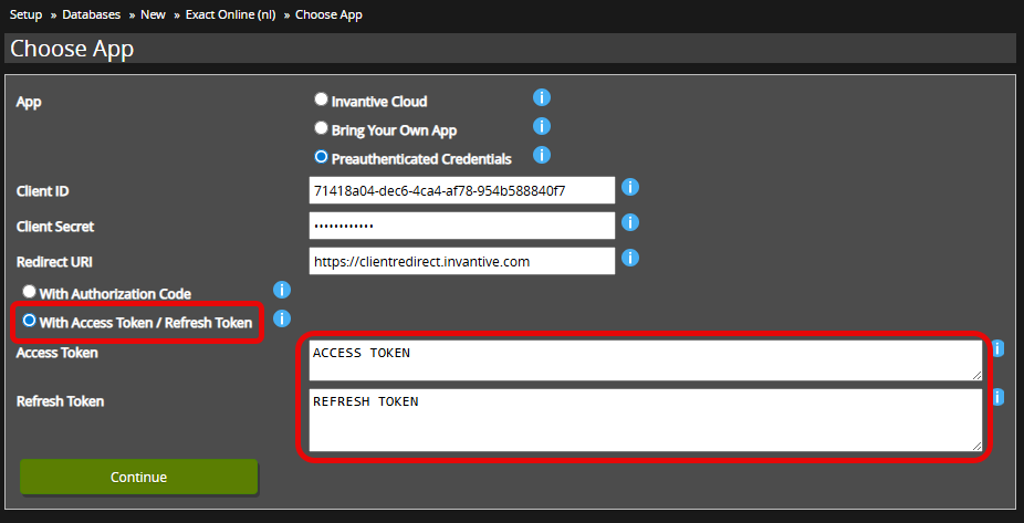 - Verwerf een Exact Online-access token en gerelateerd refresh token via een eigen webapplicatie, Invantive Cloud-preauthenticatie of een andere wijze.