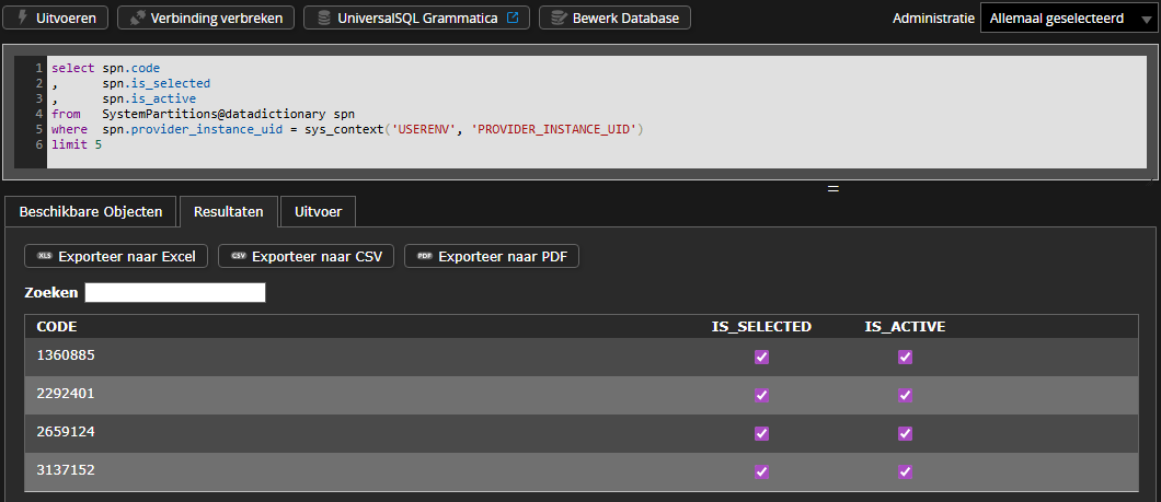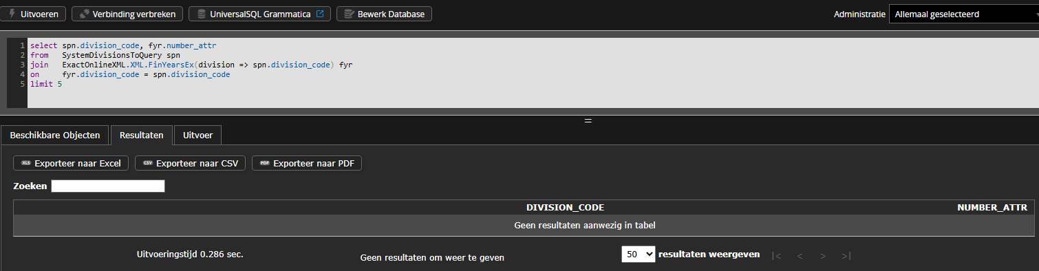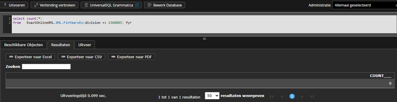 Advies is om de genoemde queries te draaien in de UniversalSQL-editor op Invantive Cloud. Deze is bereikbaar via de button “UniversalSQL” bij de database.