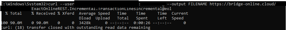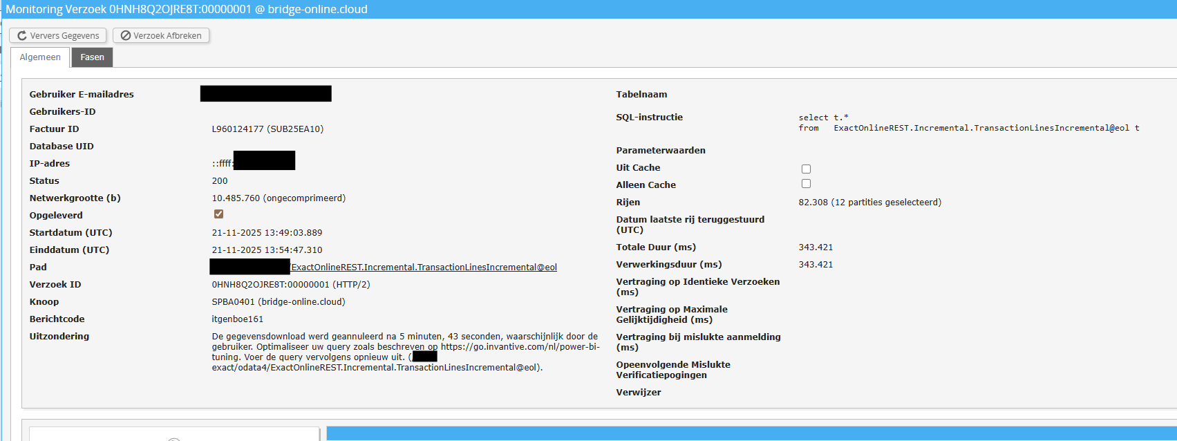 Data zit boven de 1 GB, dus het inladen wordt gestopt. De 100% in bovenstaande screenshot slaat dus niet op de volledige data. Het lokale PBI file gaf een foutmelding na ongeveer 327 MB enkel bij het ophalen van de data uit de TransactionLinesIncremental tabel.