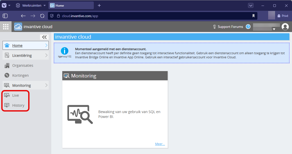 Het lukt niet om het probleem van ontbrekende monitoring te reproduceren; zie onderstaande screenshot op https://cloud.invantive.com/app als service account: