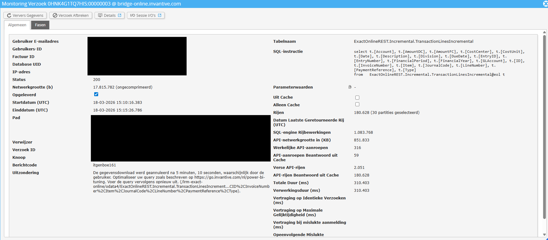 Ik kom wat problemen tegen bij het vernieuwen van data uit Exact Online op powerbi.com. Ik heb in Power Query Timeout en Cache control toegevoegd aan de TransactionLinesIncremental-tabel maar zonder resultaat. Alle rijen lijken in te laden maar uiteindelijk wil het Power BI-rapport toch niet updaten. Enige advies om dit op te lossen (zie monitoring hieronder)?