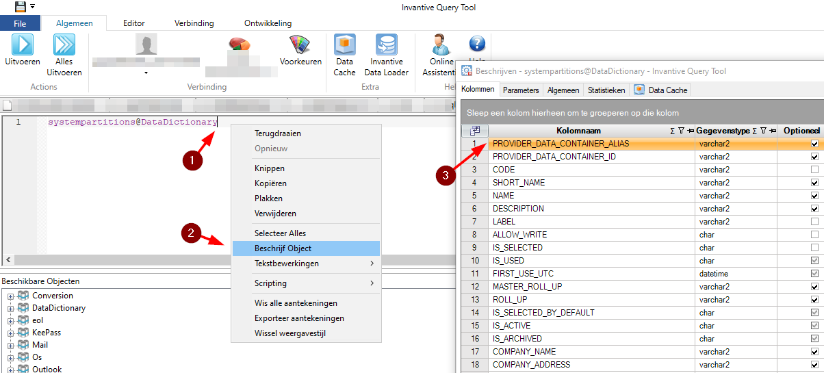 Je kunt dit zelf analyseren door de tabelnaam systempartitions@DataDictionary in het query tool te zetten, rechtsklikken en kies ‘Beschrijf Object’ of druk op F4. Je ziet dan dat de nieuwe veldnaam is: