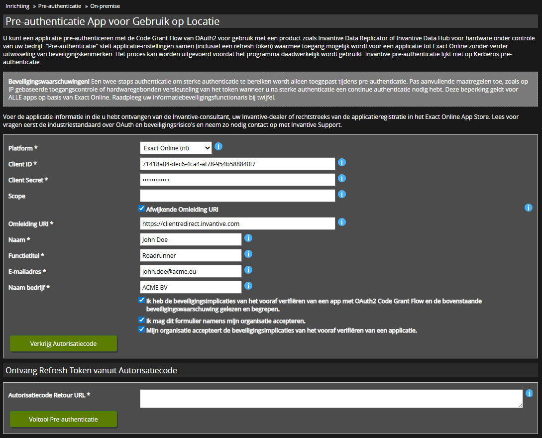 Selecteer de “Verkrijg Autorisatiecode” knop en autoriseer op Exact Online: