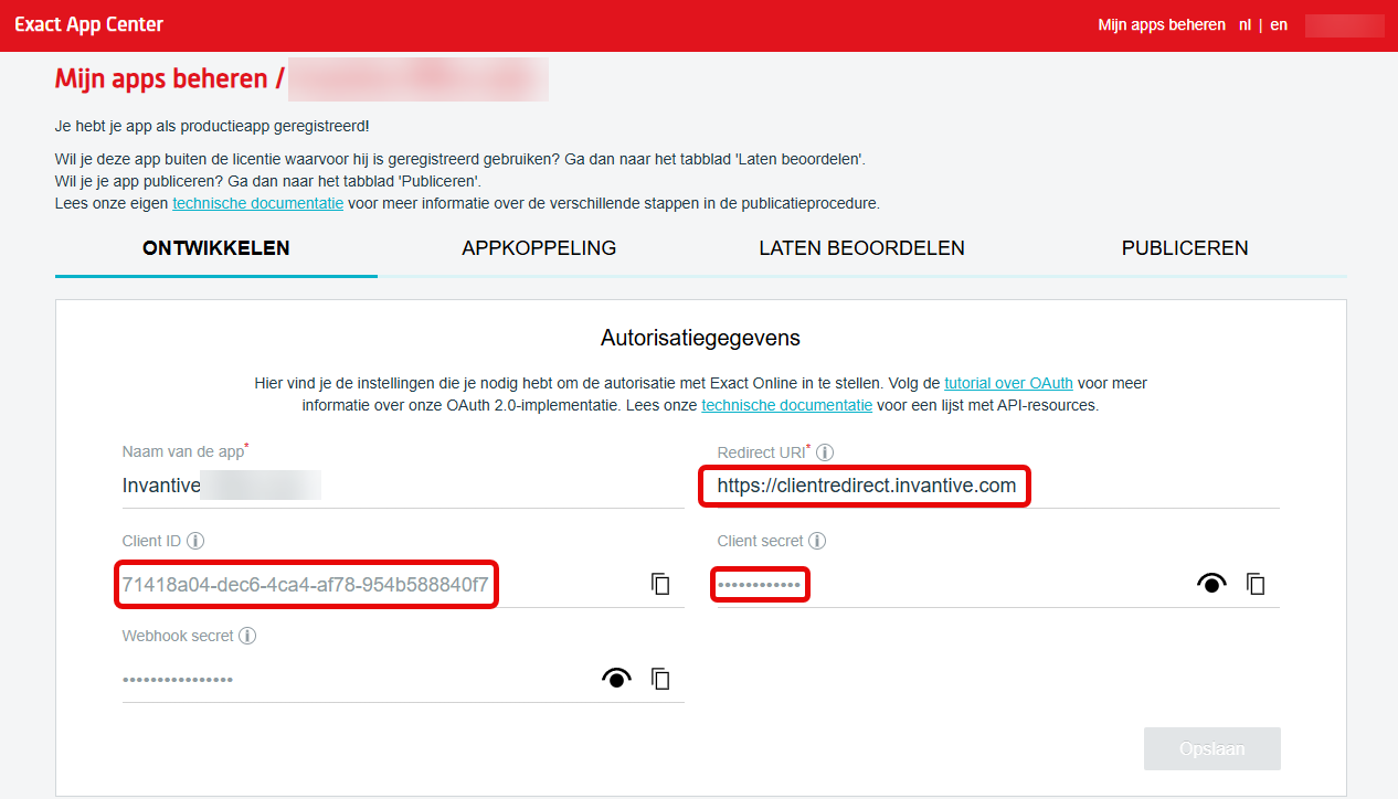 Neem de client ID, client secret en redirect URL over van de applicatieregistratie op het platform (in dit geval Exact Online, per platform ziet het er anders uit):