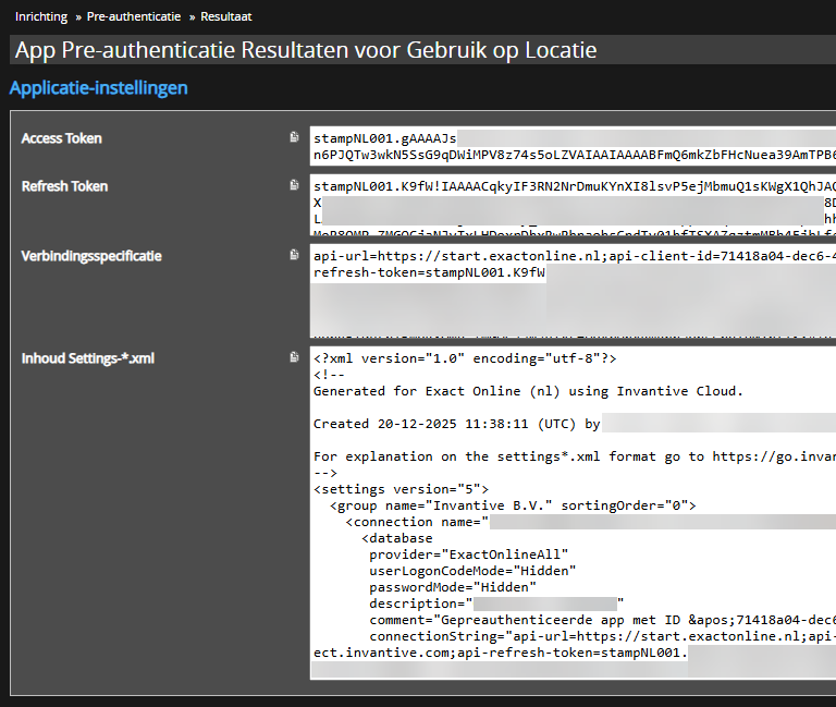 Het access token en refresh token kunnen gebruikt worden in bijvoorbeeld Postman, maar ook als pre-authenticated credentials voor het aanmaken van een Invantive Cloud-database.