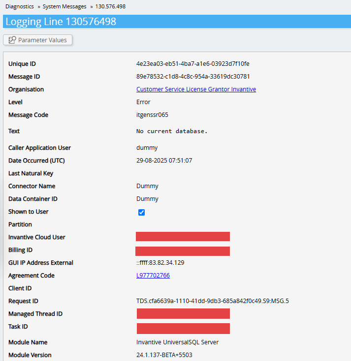 Bij gebruik van Invantive Cloud met UniversalSQL Server missen wat velden qua inhoud in de systeemberichten: