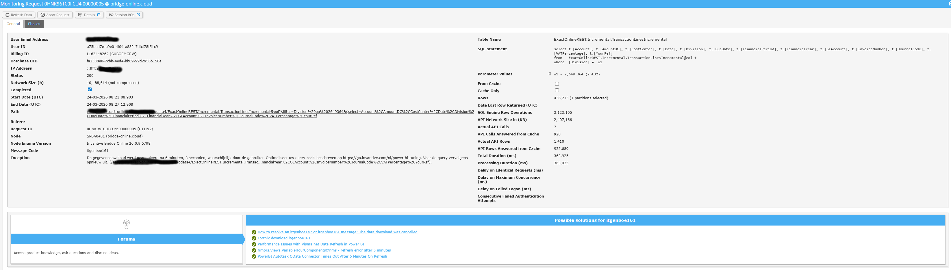 In addition, the Invantive Cloud user who has the error message will usually receive on his email address an email with an error message and tips if there is an error message in Power BI, Power Query, Azure Data Factory, Qlik or Tableau.