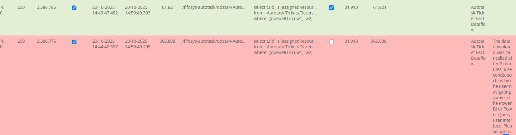 I have a PowerBI Gen 1 Dataflow (on a workspace with a PPU license) that is accessing our Autotask OData connection. It times out after 6 minutes and a few seconds no matter what I do. I have smaller dataflows that work fine.