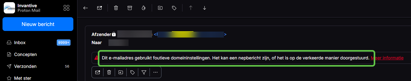 Bij controle wordt dan het e-mailbericht teruggevonden in Proton Mail met de volgende melding bovenaan: