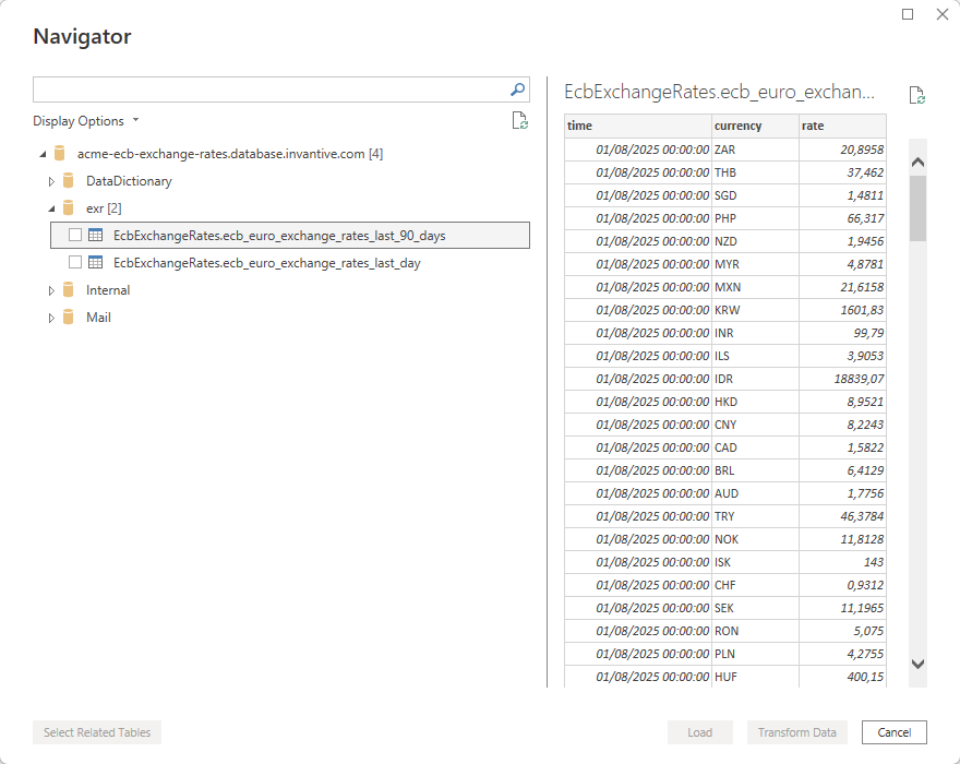 The service providers of an Invantive UniversalSQL database can be found under “System Databases”. All other providers (such as the online ECB exchange rates in the example above) are listed as regular databases. Items such as column names can also be easily expanded.
