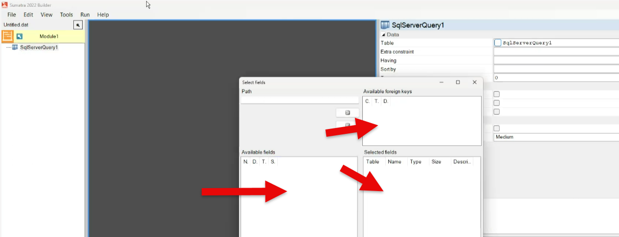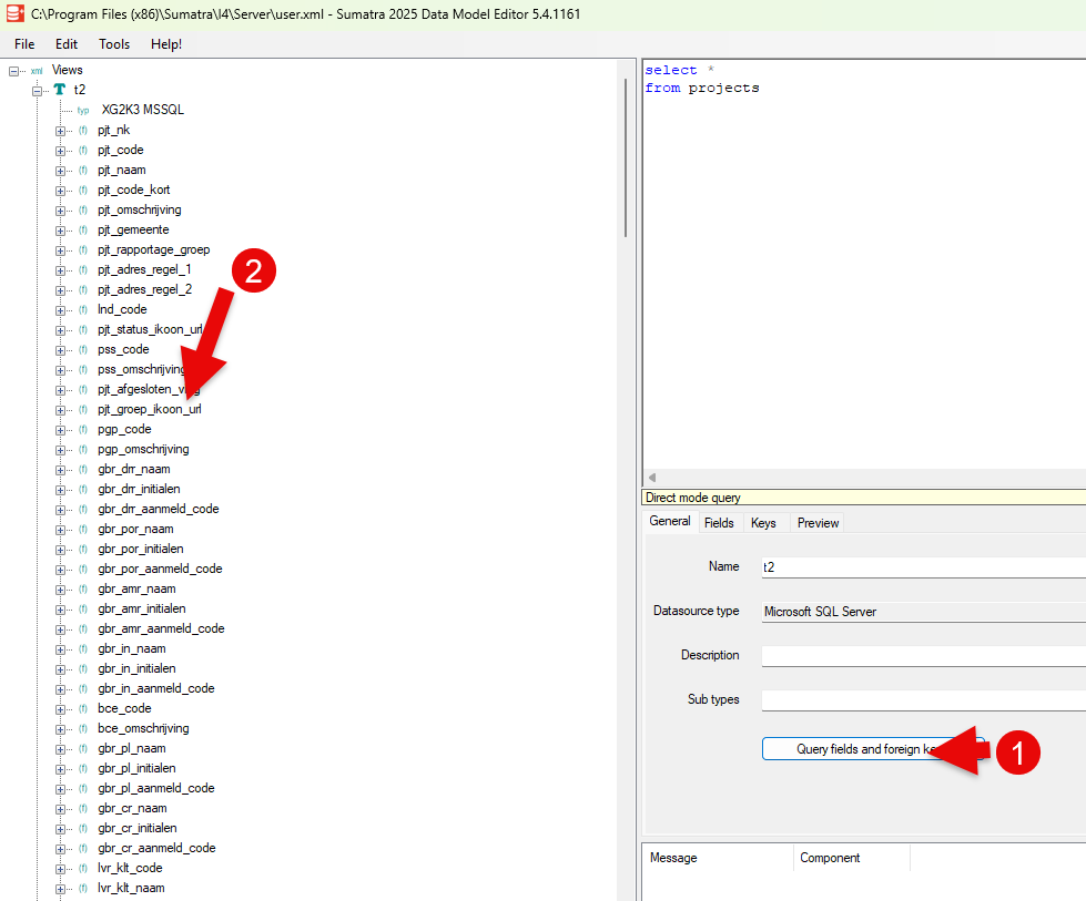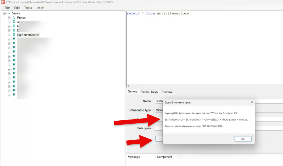 Met een SQL Server-query in de builder werkt het wel, maar deze query werkt niet als Sumatra query (view).