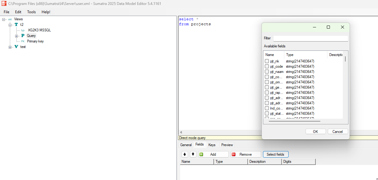 Als ik de view koppel, dan krijg ik ook geen tabellen of velden: