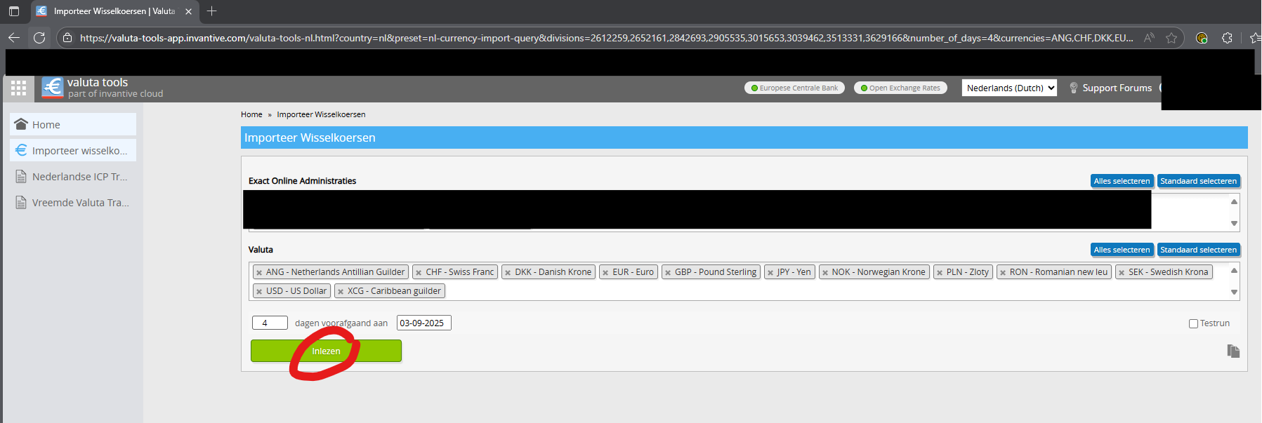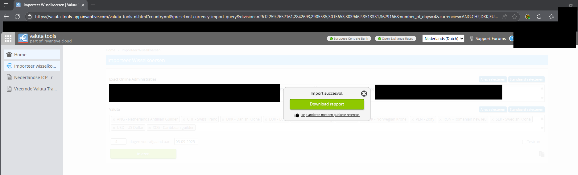 Deze ochtend hebben wij geprobeerd de koersen in Exact Online in te laden via Valuta Tools, na het klikken op “Inlezen” verschijnt direct enkel en alleen de melding “Import succesvol”, echter is er helemaal niets ingelezen in Exact Online.