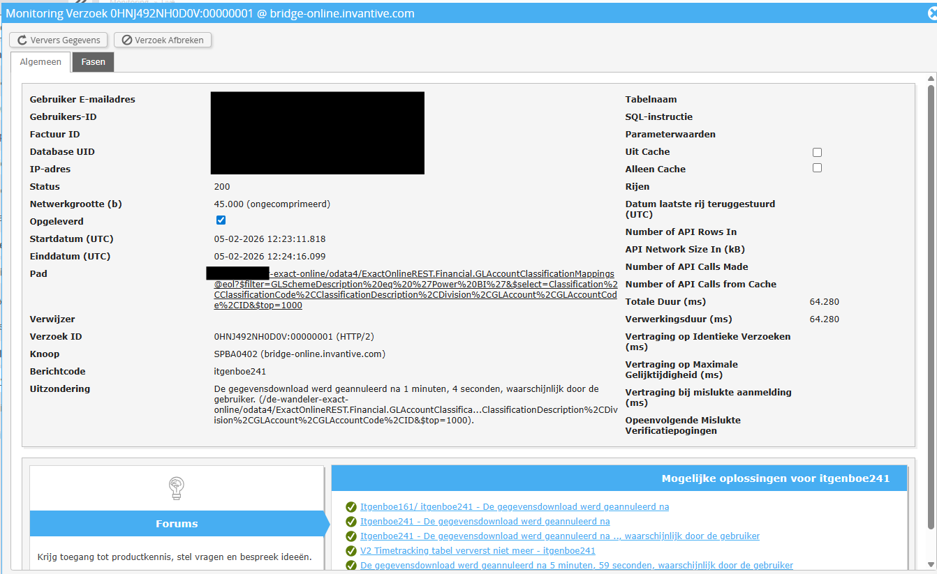 Advies is om de time-out te controleren zoals beschreven in Vermijd time-out fout bij Power BI OData download en andere suggesties die u vindt door op itgenboe241 te zoeken. U kunt ook de hyperlinks aanklikken bij: “Mogelijke oplossingen voor itgenboe241” in Invantive Cloud Monitoring.
